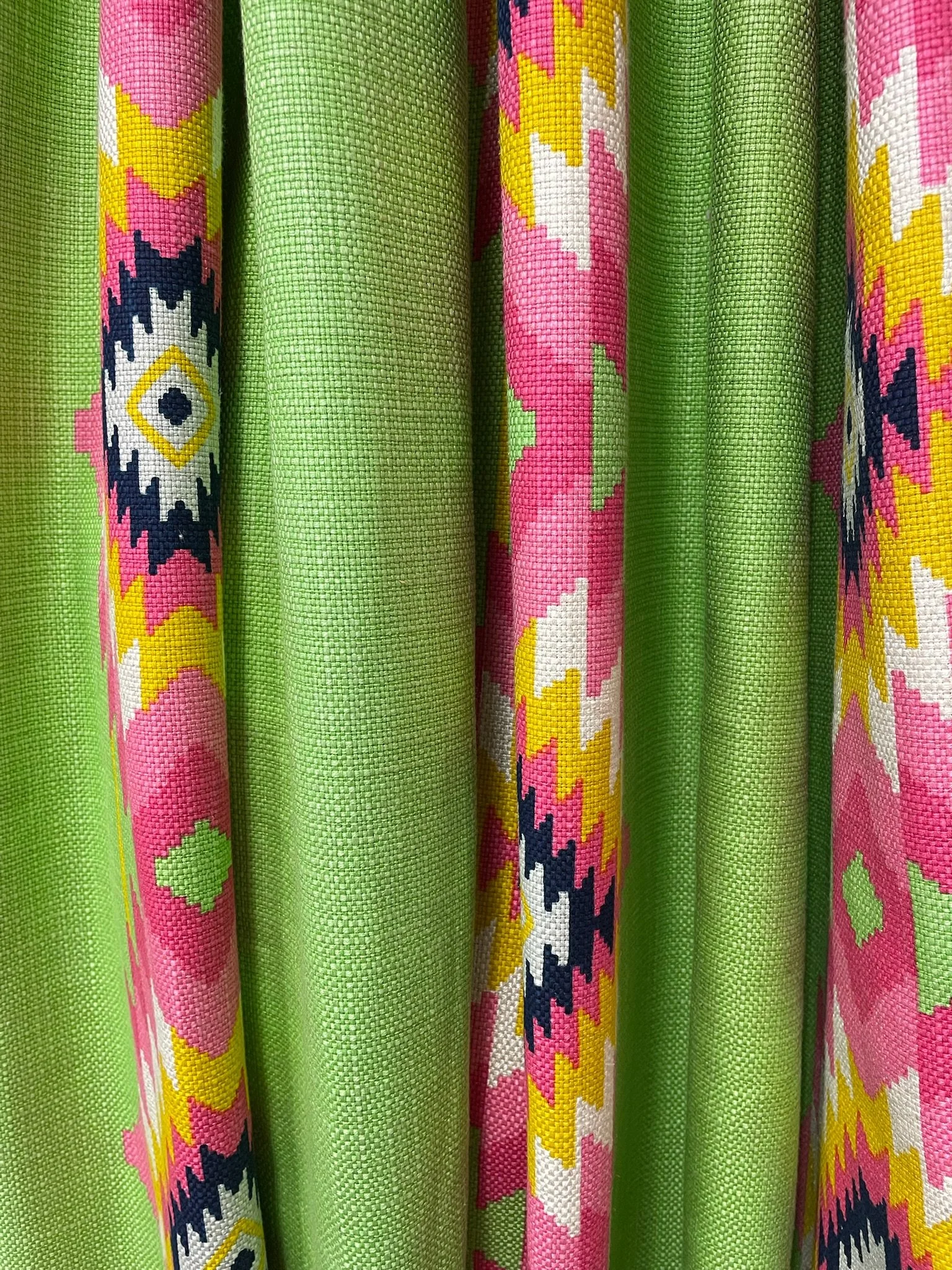 Fabric: Cruz, in this cactus colourway from Andrew Martin is a colourful kilim weave. Bold and bright green background with kilim stripes in pink, yellow and navy (RRP £90/m)