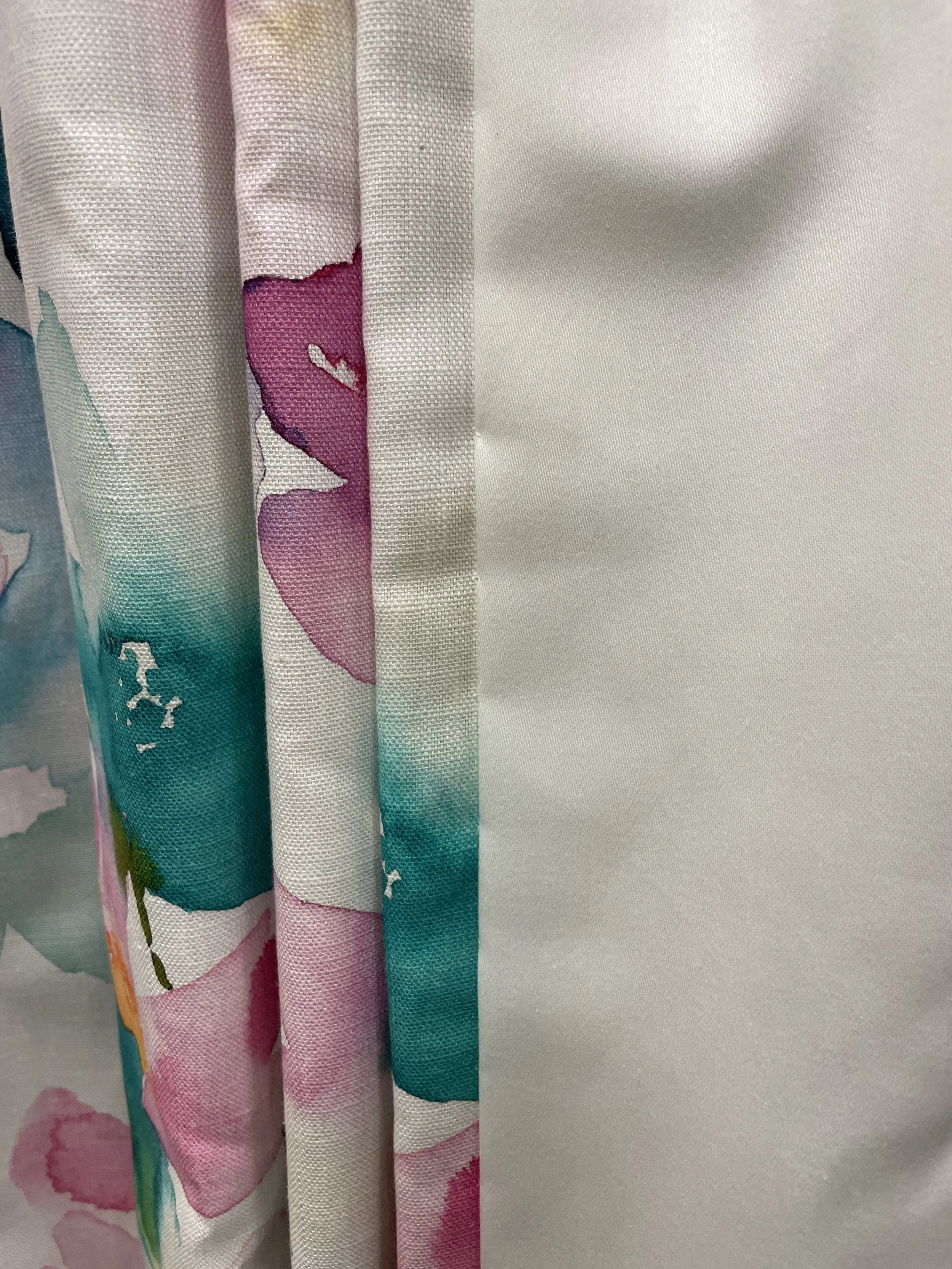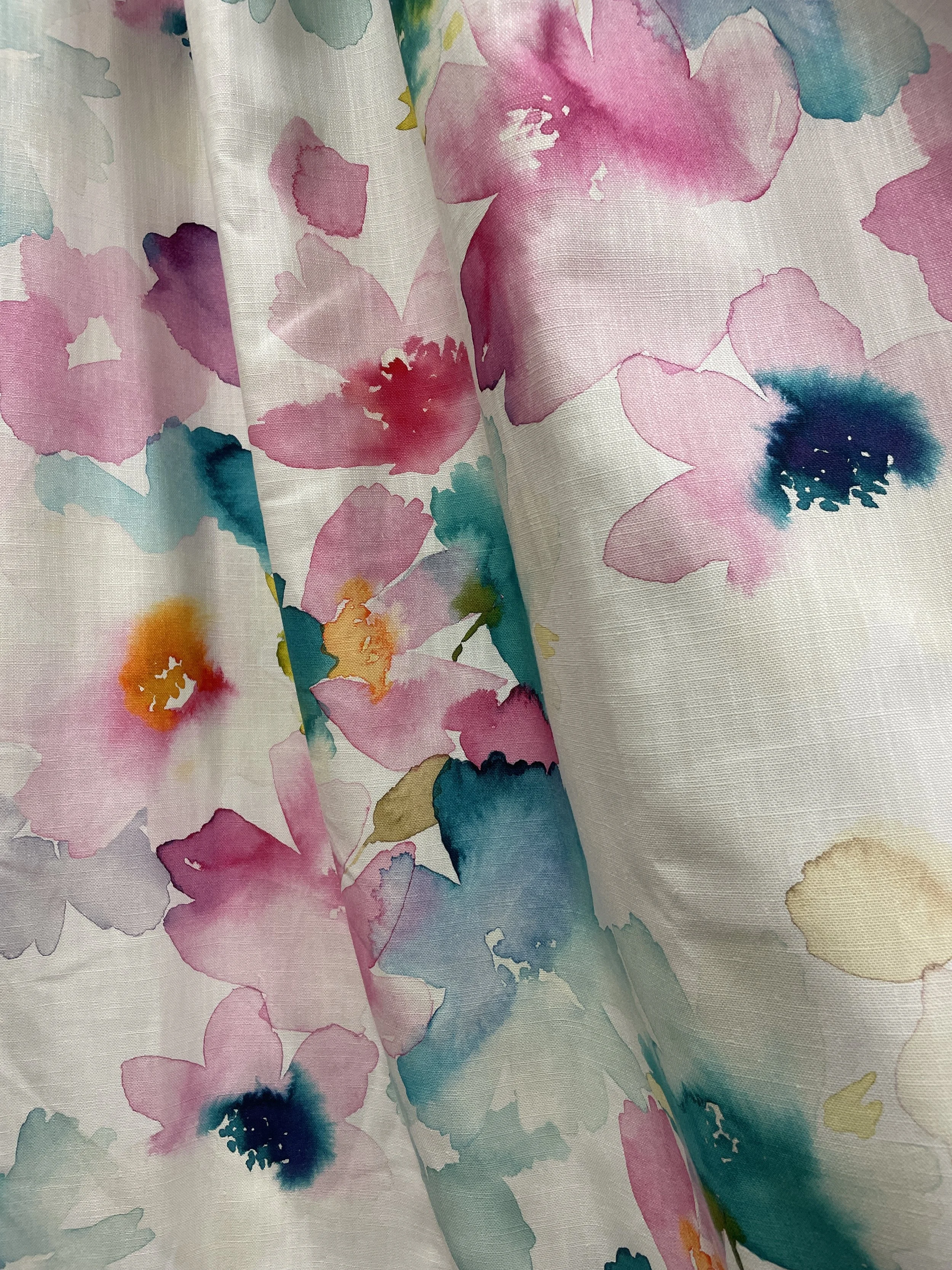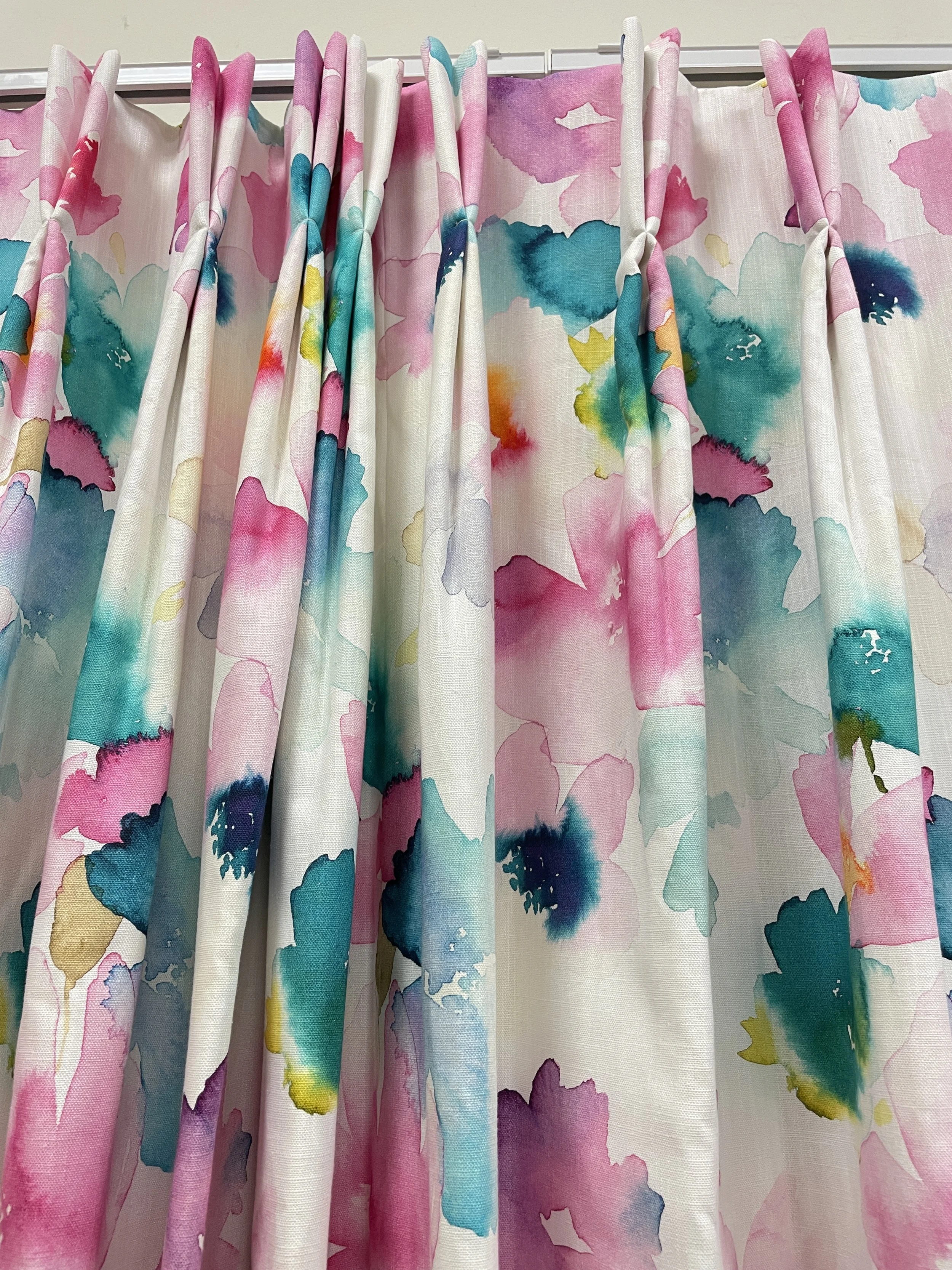 Fabric: Cotton/linen mix, abstract floral watercolour blooms in teals, purples, blues and pinks. There are 4 widths of fabric in these curtains.