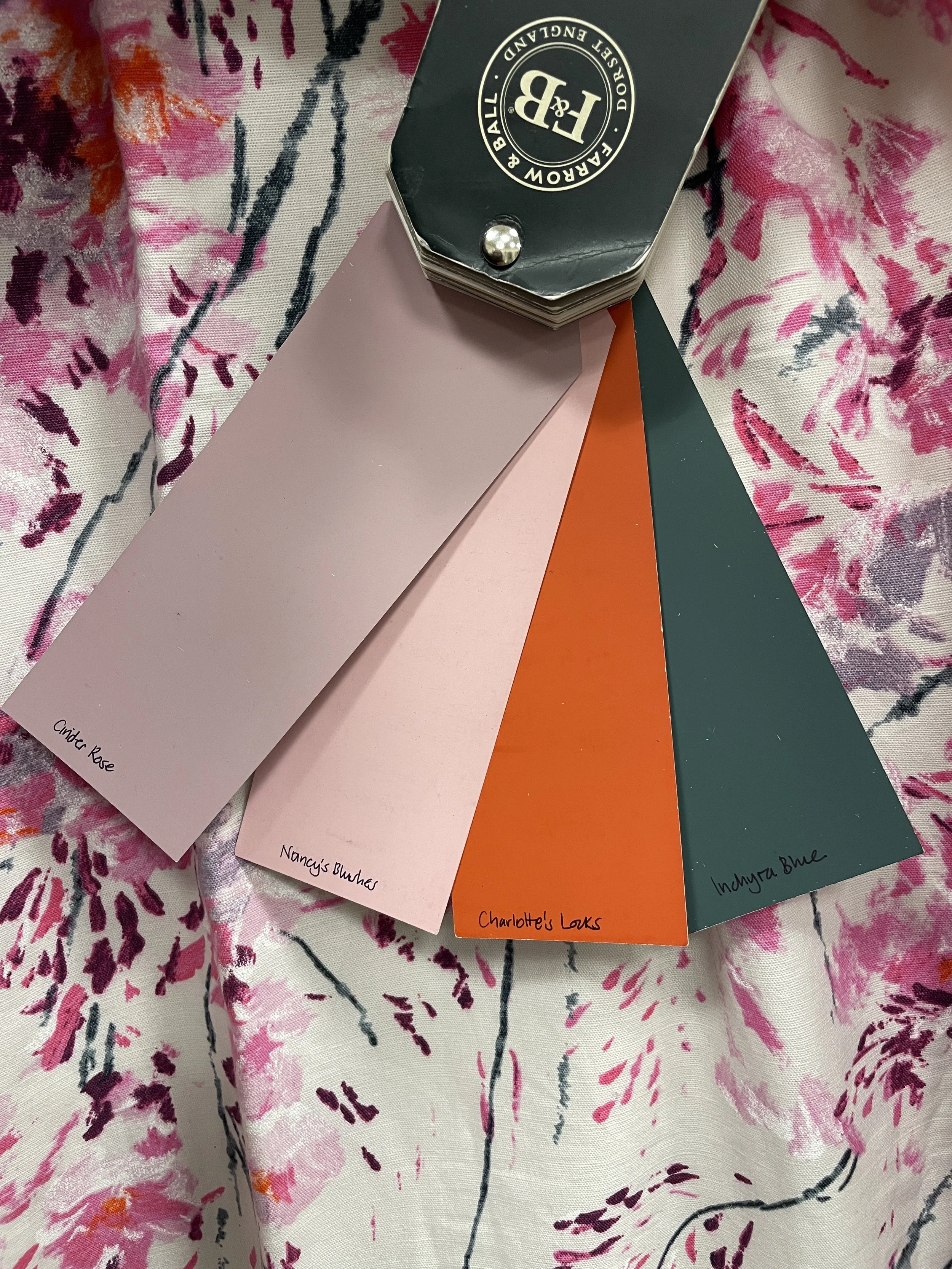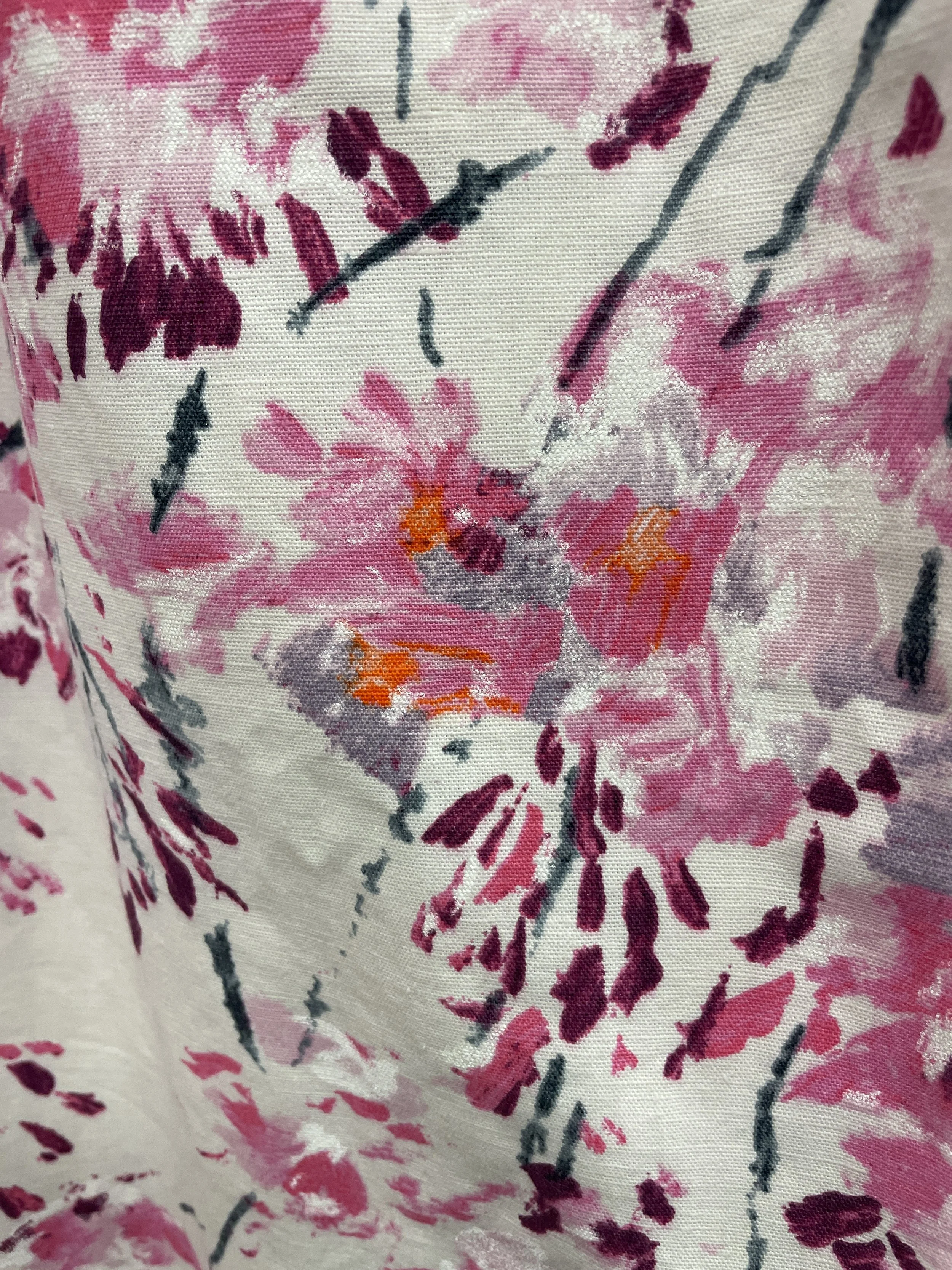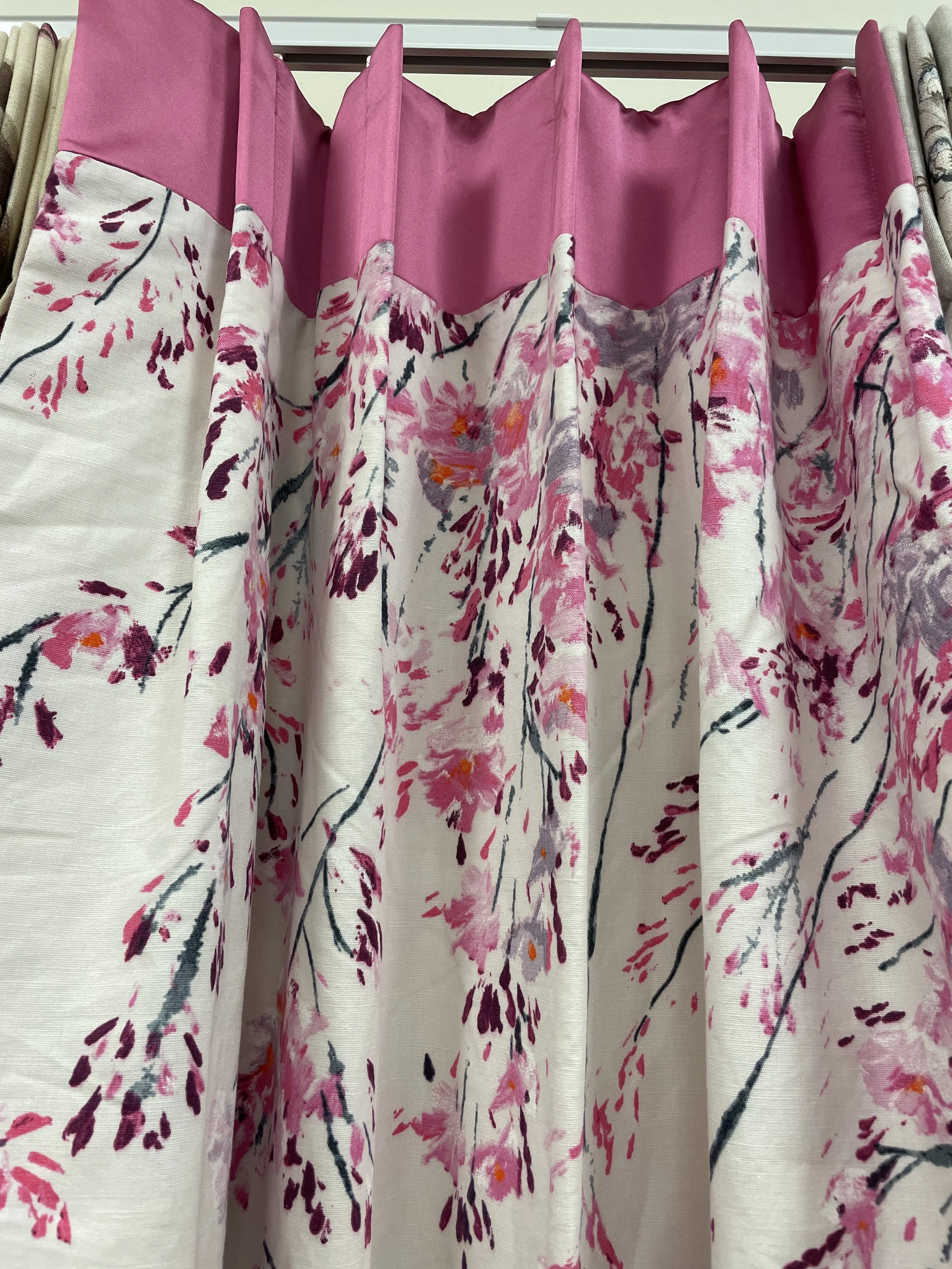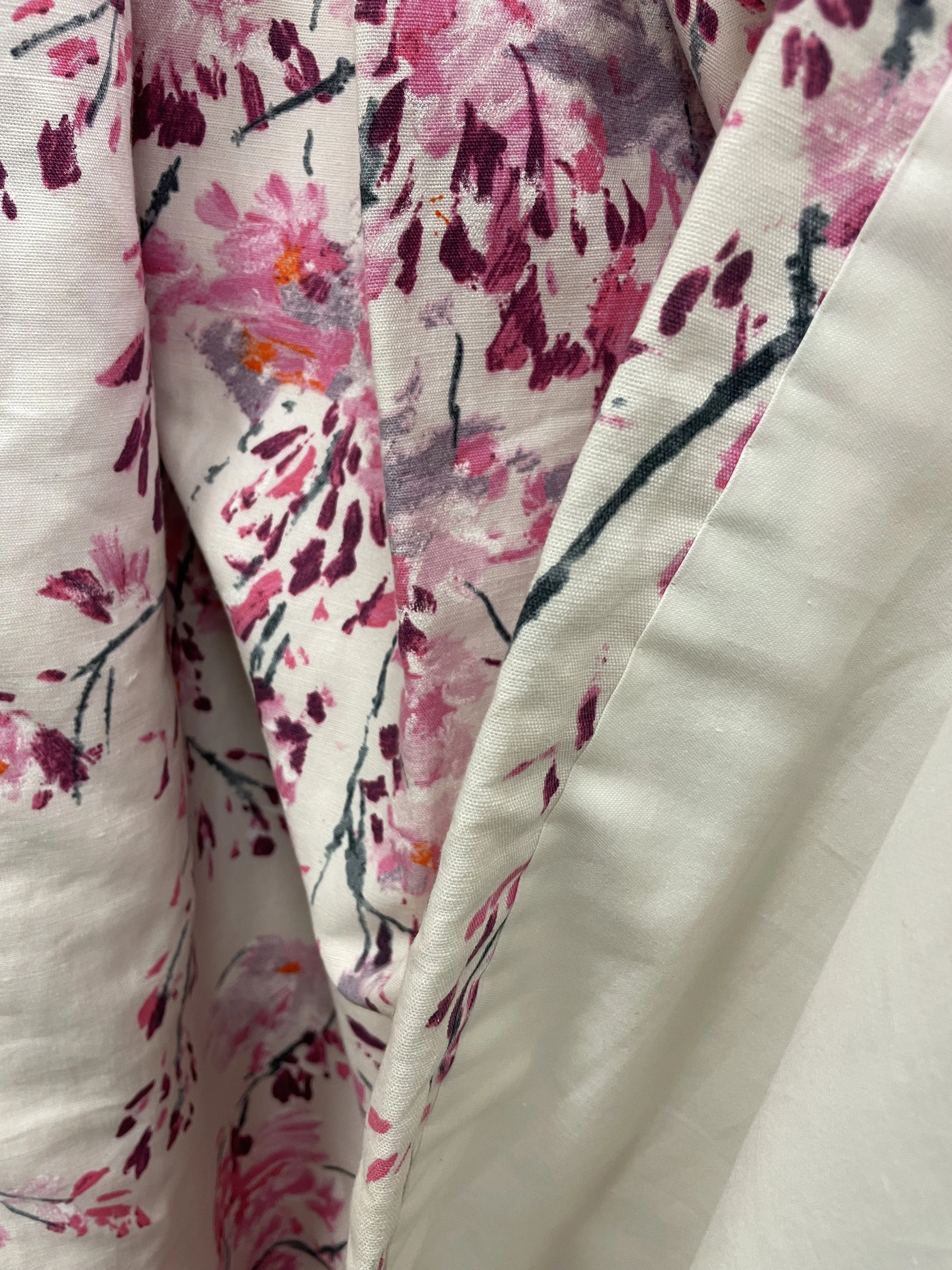 Fabric: This Designers Guild fabric, made up by John Lewis, features delicate trailing plum blossoms, in subtle pastel pinks to richer shades of orange, purple and dark teal. These would be great as dress curtains with a blind over a window. Otherwise suitable for a metre wide pole.