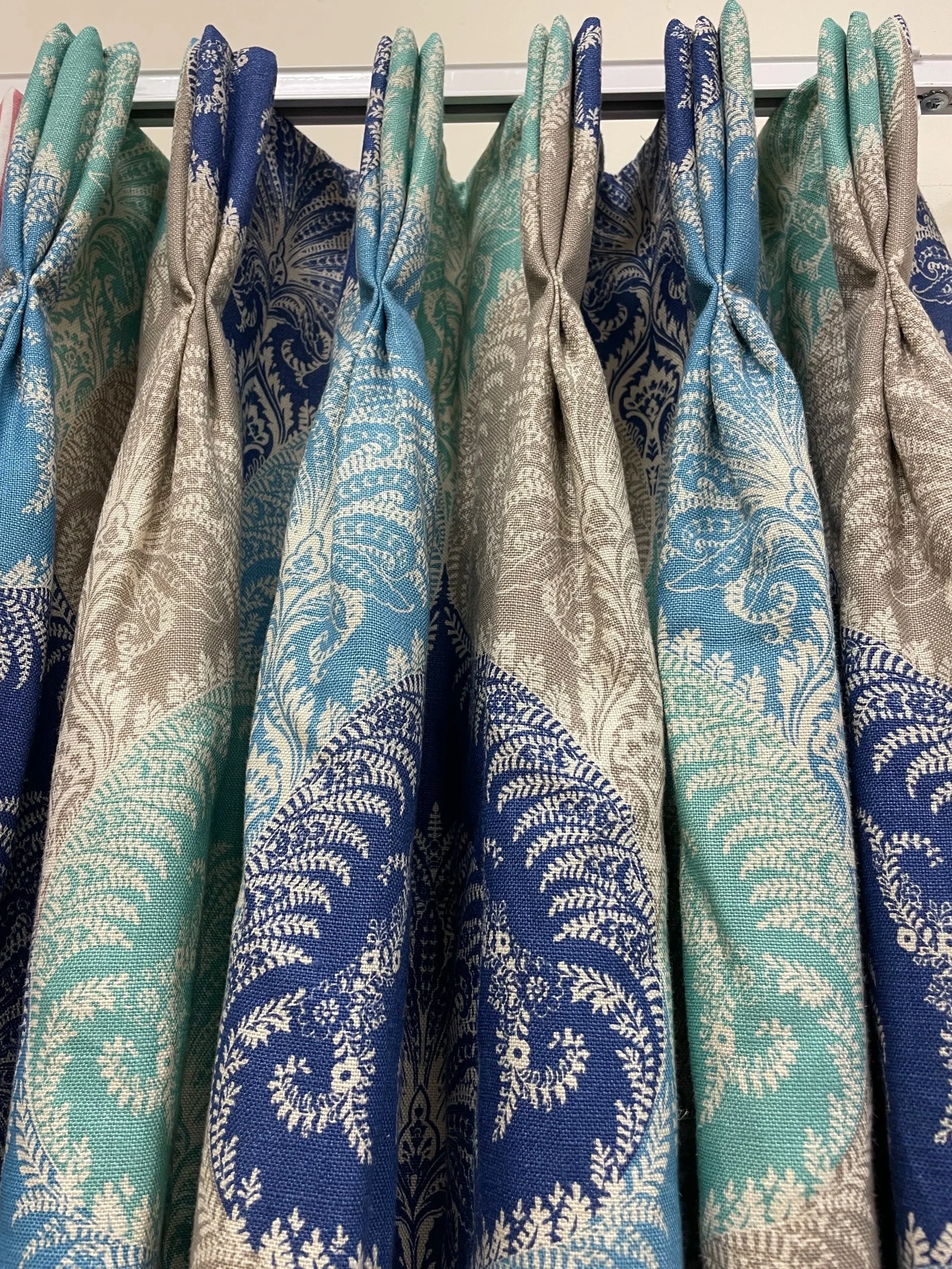 Fabric: ‘Suleyman’ by Osbourne & Little, a beautiful ogee pattern of contrasting teal, blue and beige printed on pure linen. There are 1.5 widths of fabric in each curtain.