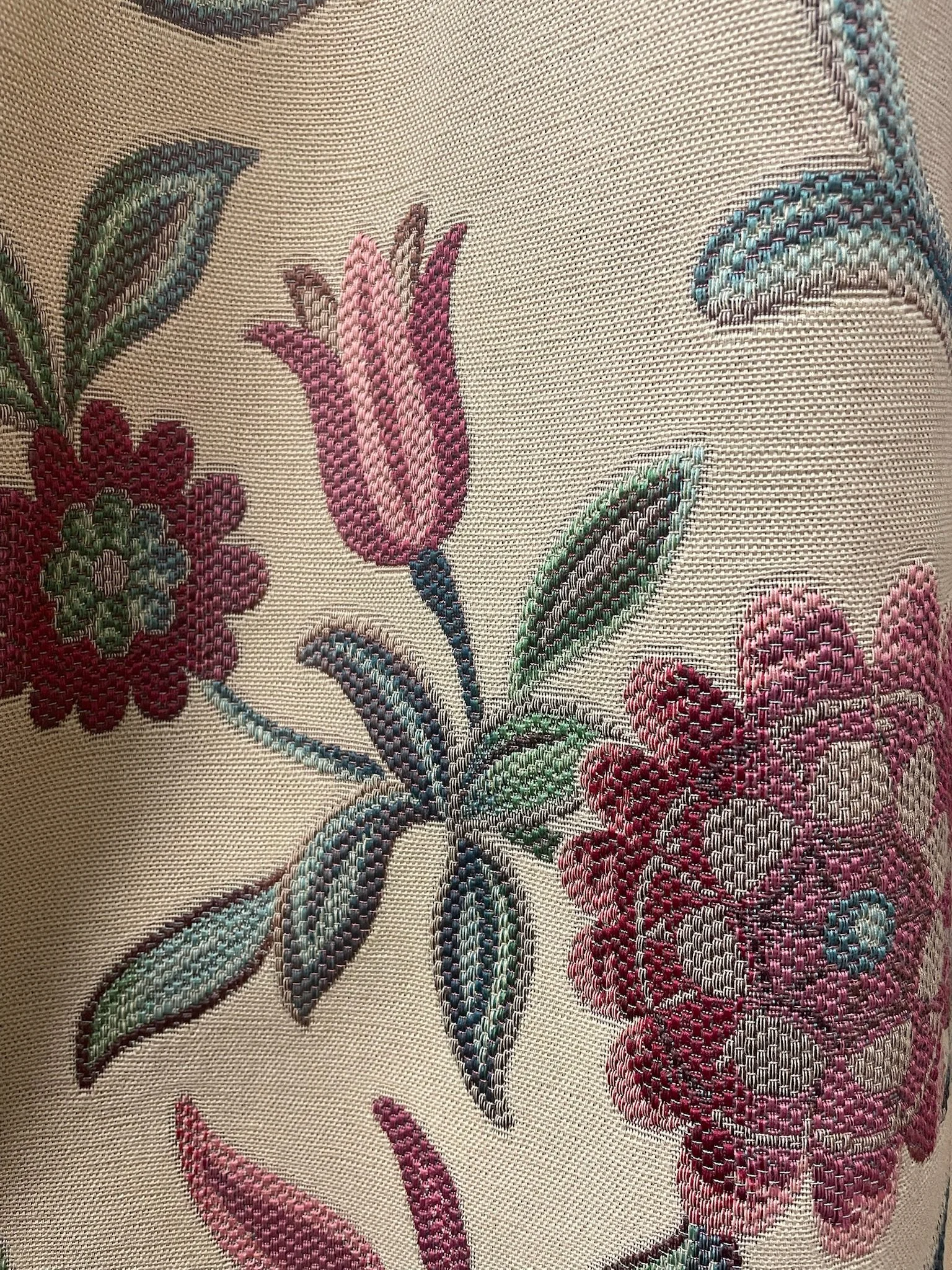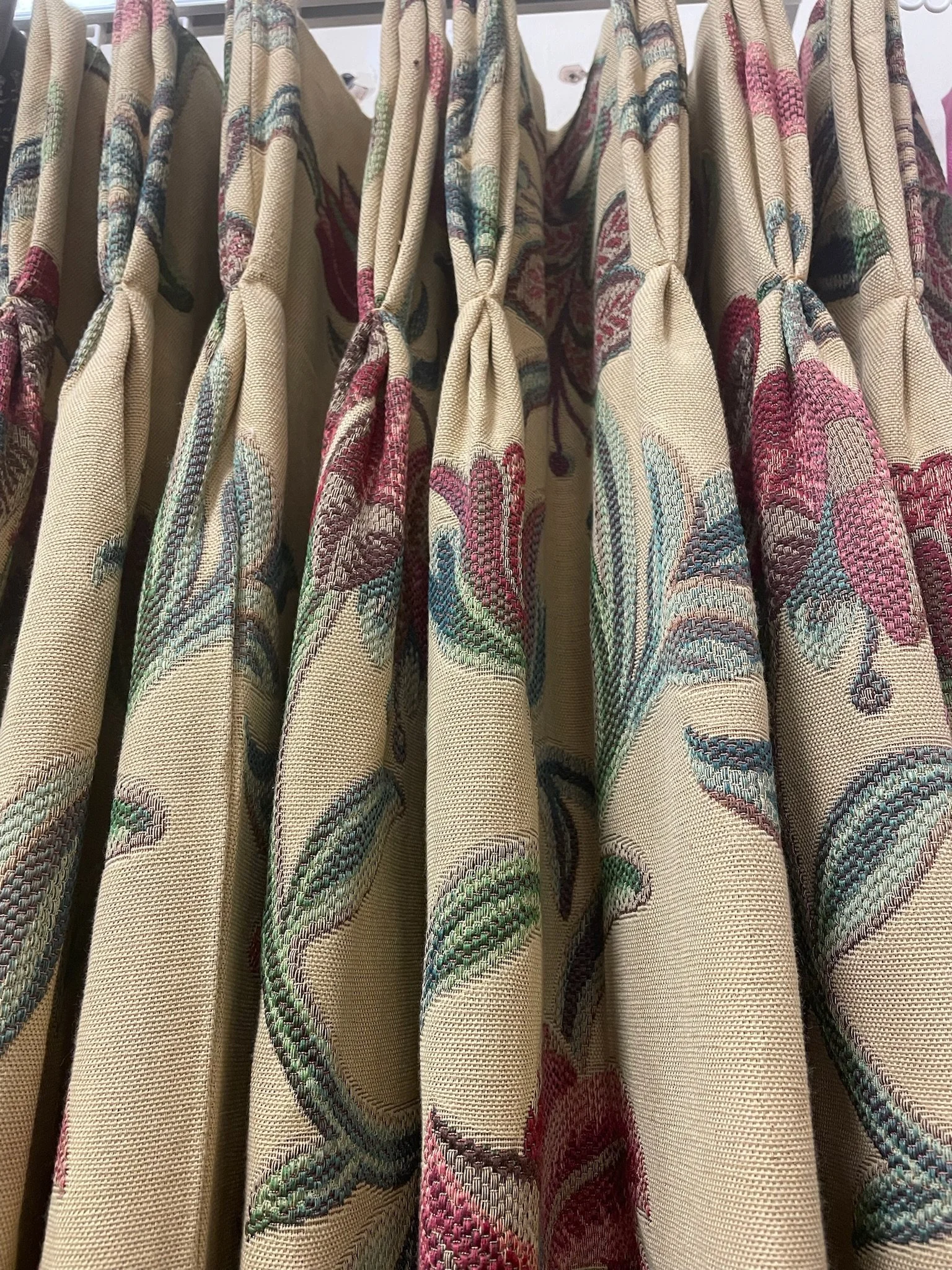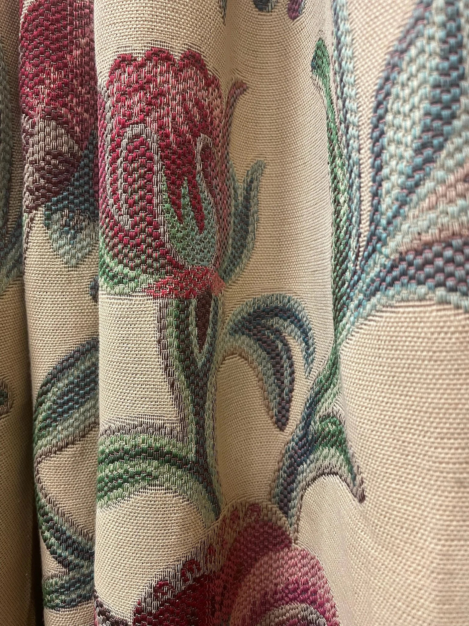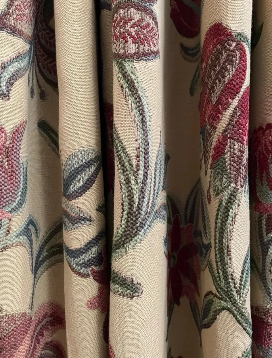 Fabric: A tapestry style fabric. A deep stone coloured base colour with burgundy, pink, red and green flowers and leaves. Linings in good order. Three widths of fabric in this pair.